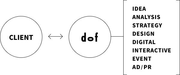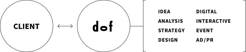 With the notion of “Communication Design”, which we started advocating in 2005 upon the establishment of dof, we have leaded various cases of challenge identification and problem solving in any realm of business; not only in marketing fields such as ads or creative production but also designing and developing products or services, developing strategies of sales, pricing, HR and management.
