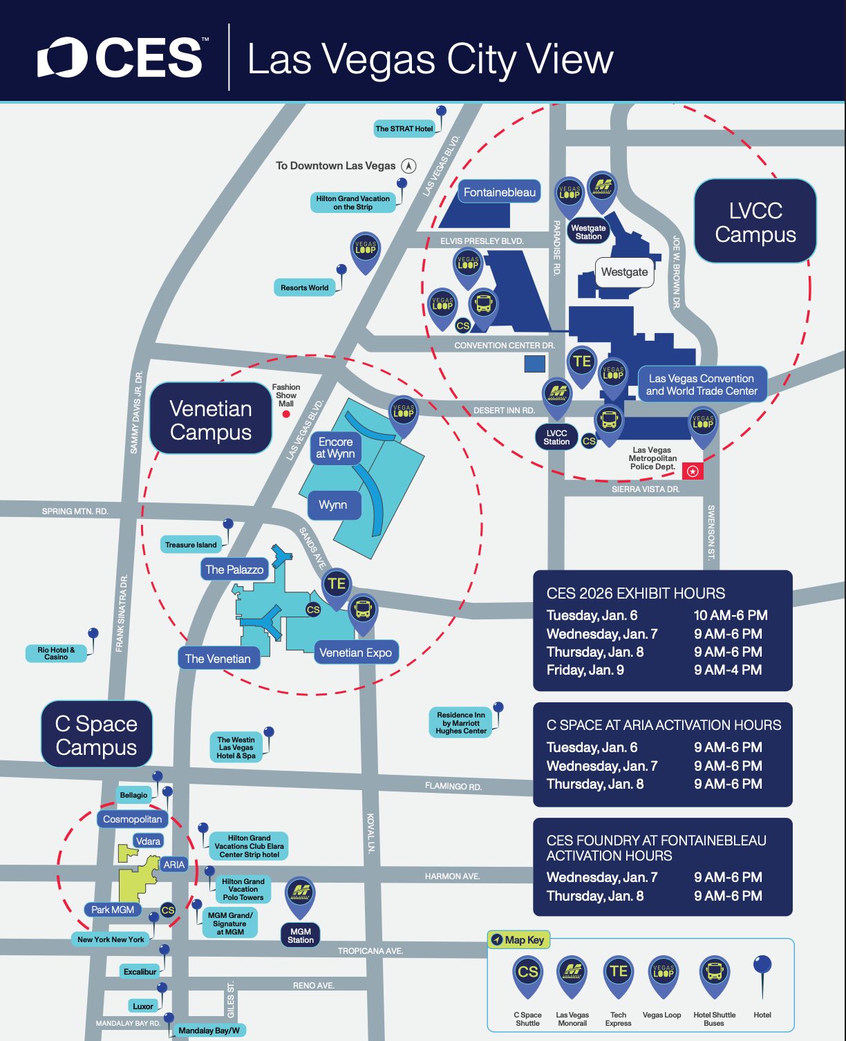 なんと言ってもCESは一般公開の会期が約4日間(JMSは約10日間)という短さなのに、会場の広さはJMSが開催されている東京ビッグサイト約2個分(東京ドームで言うと5個分)という広さ。しかも、JMSは東京ビッグサイトの単一会場のみですが、CESはLVCC(ラスベガスコンペンションセンター)、Venetian Expo、C Spaceに加え、今年から新設されたFontainebleau Las VegasでのCES Foundryなど、ラスベガス市内に複数の会場が点在するという広大な会場設計となっています。会期の4日間全日程使っても1人で回り切るのは難しい、恐ろしく情報密度の高いイベントでした。