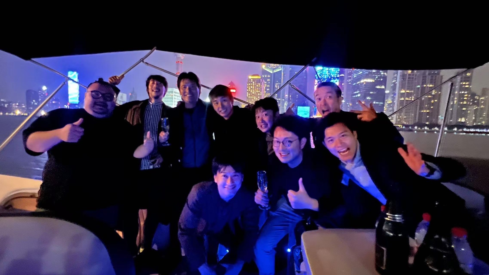 ▲ 上海の名所「外灘(バンド)」を一望できるクルーズツアーにて。dofメンバーと上海をアテンドしてくれた上海電通のみなさんと。