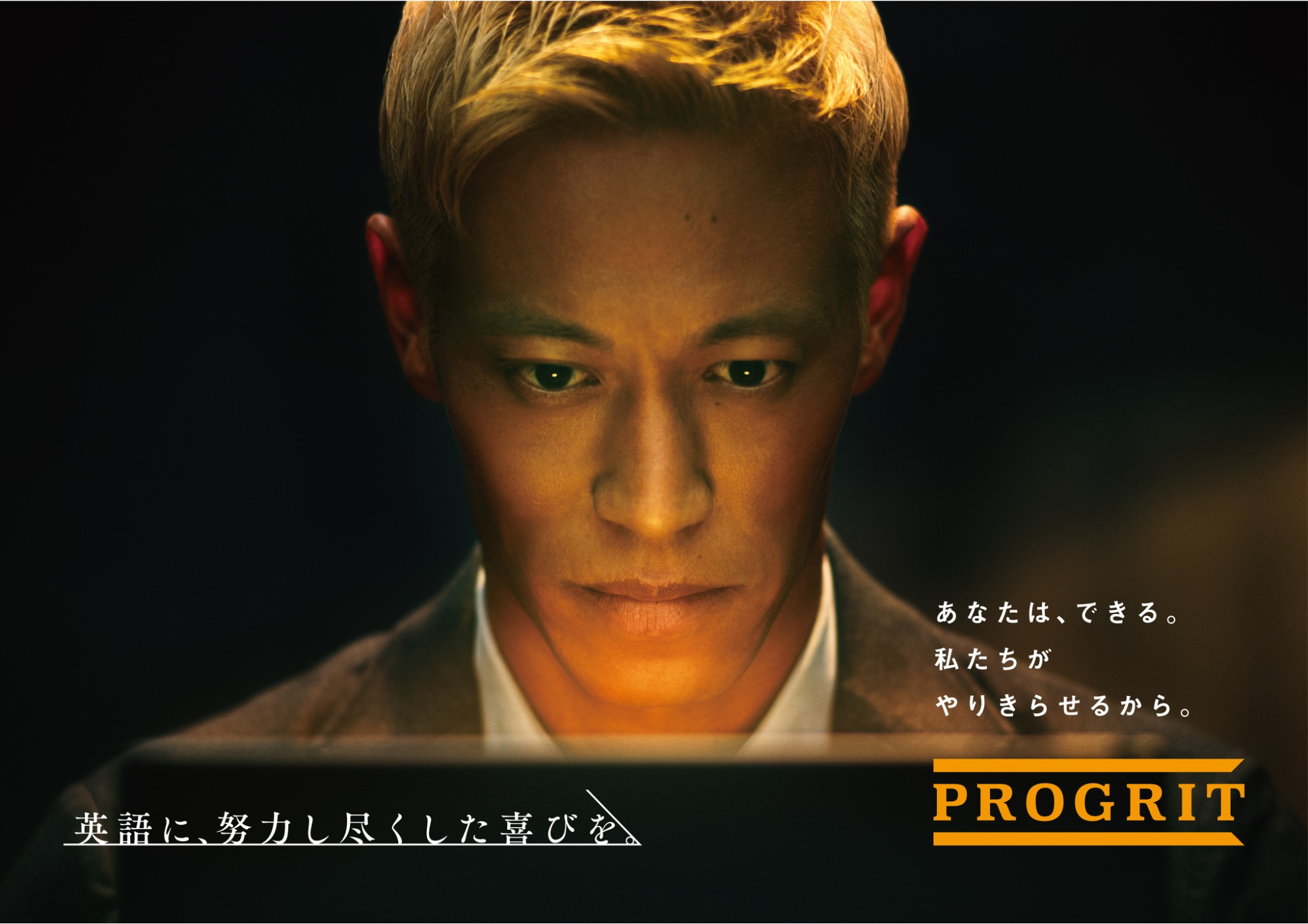 もう一つは、こちらもクリエイティブ・ディレクターとしてプロジェクトに入った英語コーチングサービスの「PROGRIT(プログリット)」のリブランディングですね。クライアントの社長から現場メンバーまで徹底的にヒアリングを重ねさせていただき、ブランドの真ん中にある「努力」という価値を掘り起こした過程が印象的でした。また、その「努力」という価値を限界までストイックに描いて、これまでのdofのトーンとは少し違う新しいクリエイティブにチャレンジできたという意味で、印象に残っています。