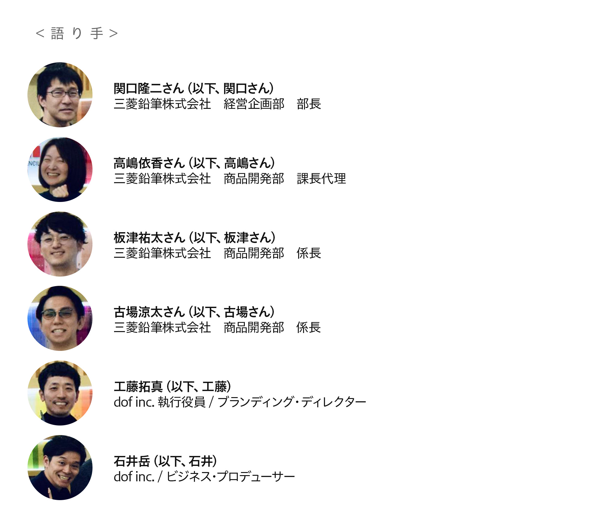 今回のdof talkでは、三菱鉛筆株式会社から開発チームの関口隆二さん、高嶋依香さん、古場涼太さん、板津祐太さん、コンセプト開発からネーミングなどのブランド開発を支援したdof執行役員/ブランディング・ディレクターの工藤拓真(以下、工藤)、dofビジネス・プロデューサーの石井岳(以下、石井)が登場。新プロダクトの誕生秘話から、北米市場への戦略、ネーミングに込めた思想、そしてZENTOが描く「これからの表現文化」まで語り合いました。どふぞご覧ください。